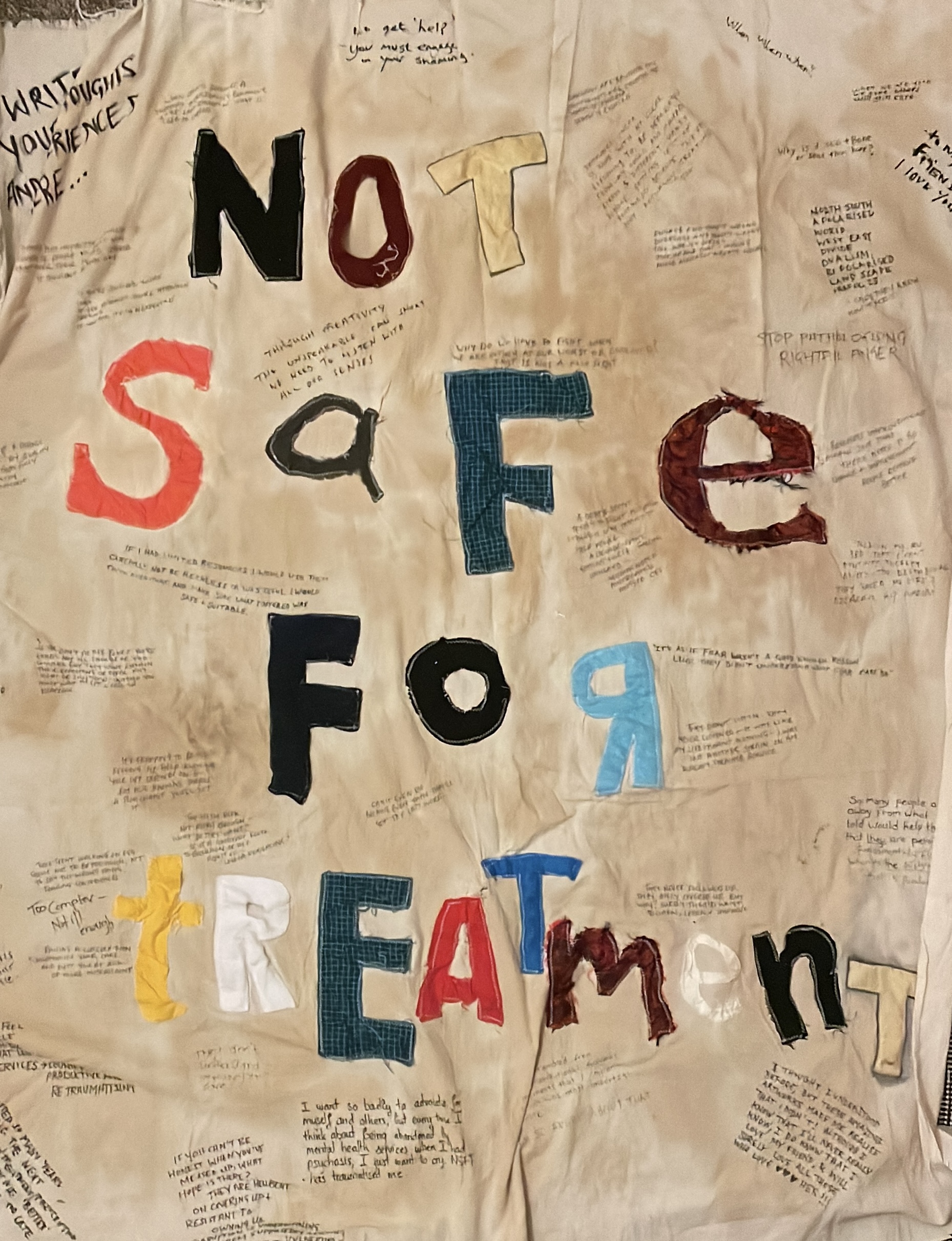 We left a banner within the space for visitors to write on, to give the opportunity for people to leave their experiences too in a quieter, safer way. We found people felt comfortable writing anonymously and as a community where people had written their experiences already.